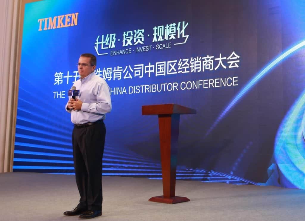 铁姆肯公司全球执行副总裁Christopher Coughlin先生首先与参会的授权经销商分享了铁姆肯公司的近期财务表现以及企业发展战略。2018年在全球工业市场走强的背景下,铁姆肯公司的销售业绩表现尤为突出。同时,铁姆肯公司在过去数年里着眼于全球范围的投资与增长,通过收购拓展产品线和市场覆盖彰显了以轴承为核心建立动力传动产品平台以服务全球客户的战略。“分销在铁姆肯公司的业务模式中起着举足轻重的作用。铁姆肯公司已经在售后市场充分布局,希望与经销商伙伴共同努力,在中国市场共同打造更加强大的Timken品牌。”Coughlin先生表示。